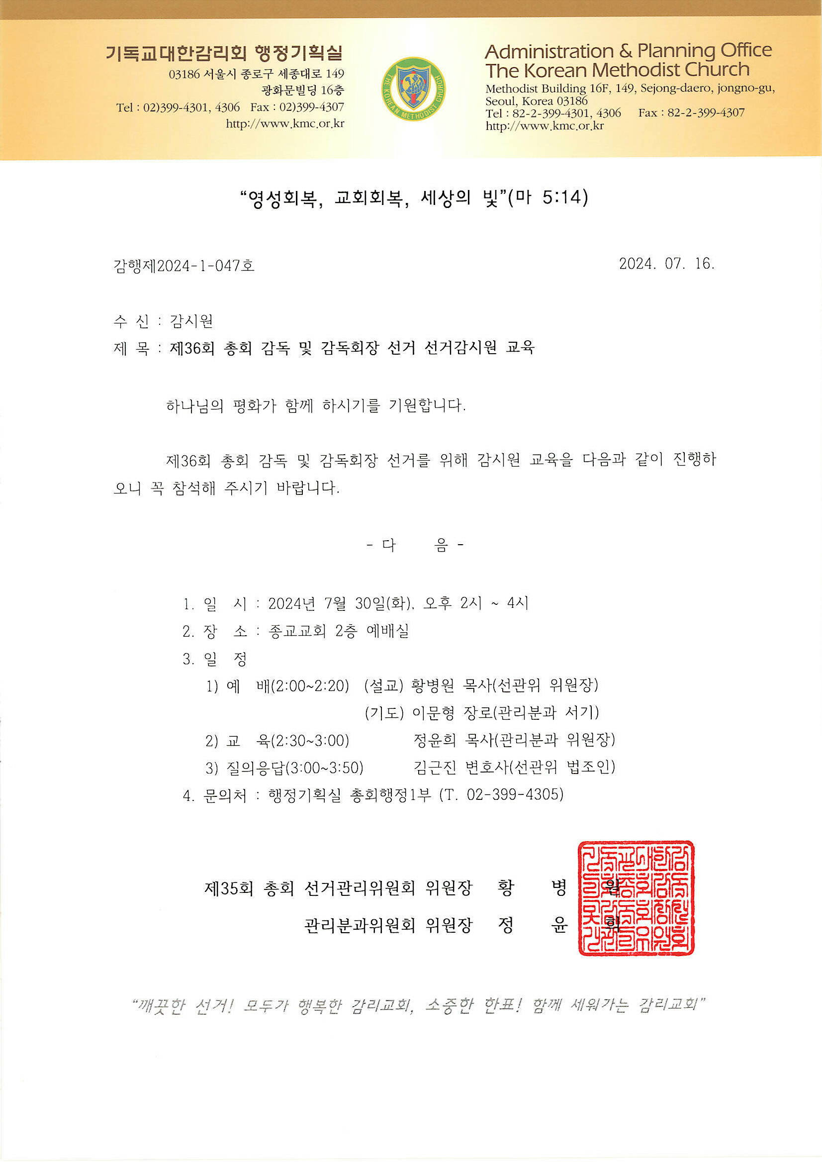 | 다음 글 | 제36회 총회 감독 감독회장 선거 후보자 공고 |