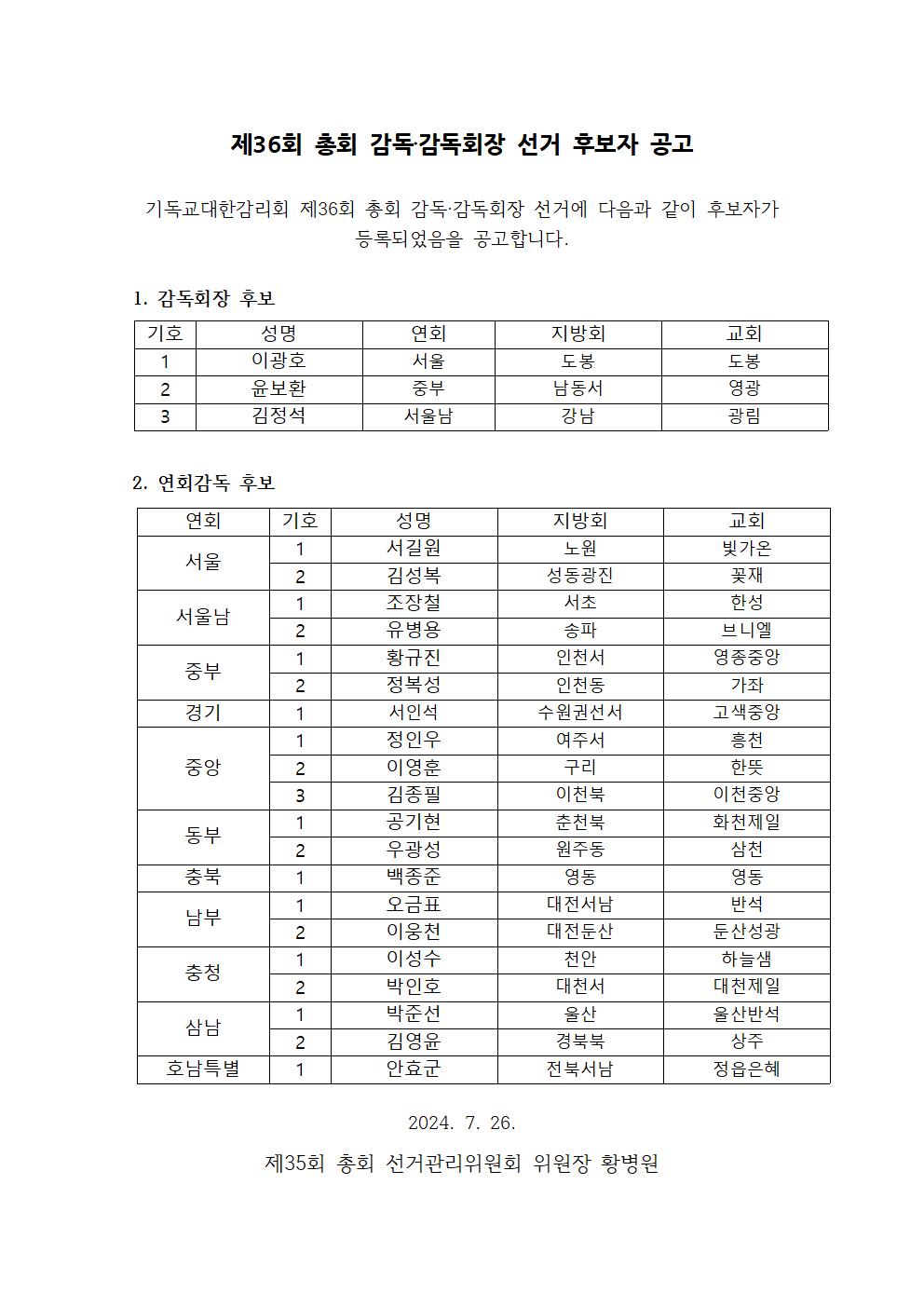 제36회 총회 감독 감독회장 선거 후보자 공고